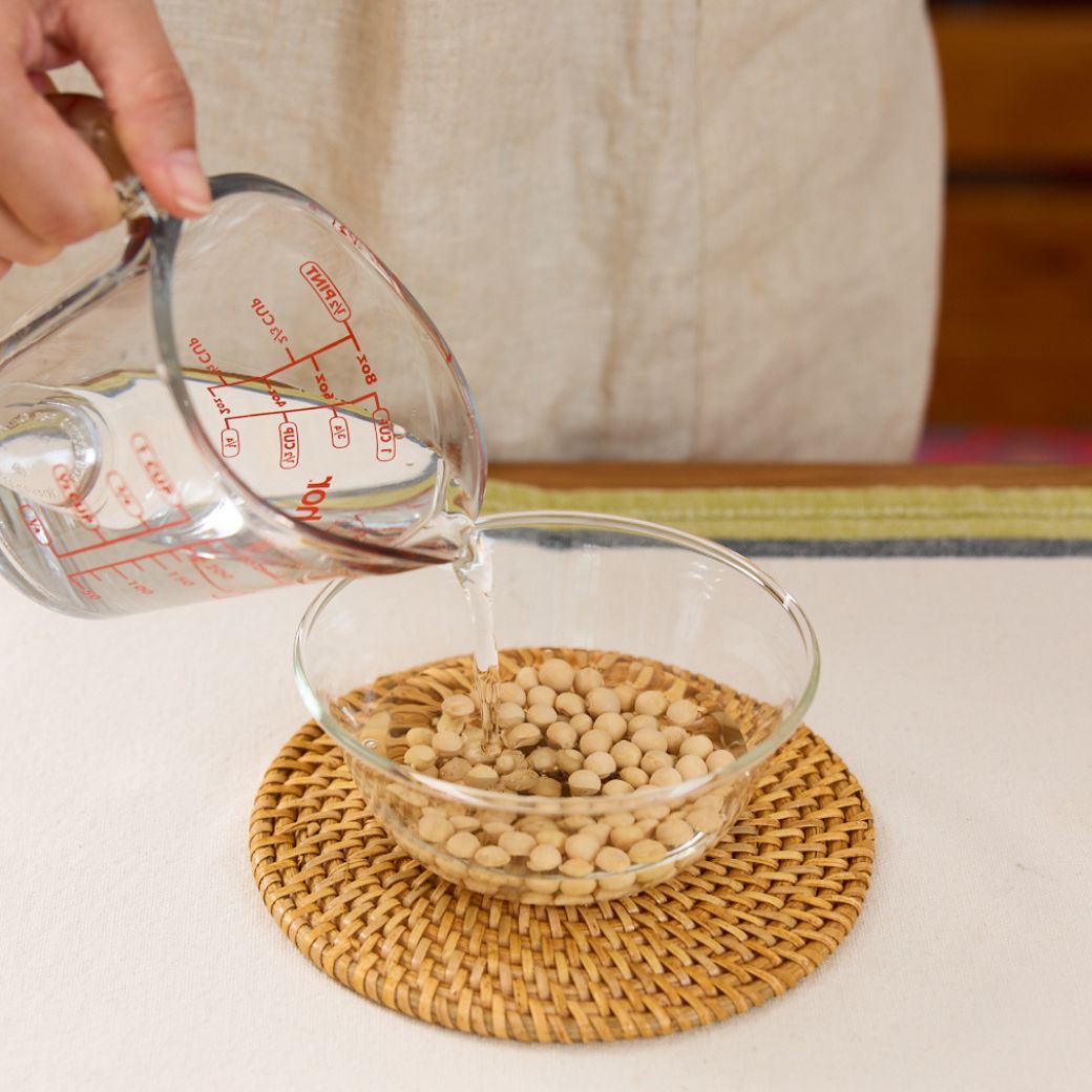 乾燥大豆をひと晩水に浸すか、軽くすすいでください。大豆を水に浸すと、中心部まで吸水して、芯まで熱が伝わりやすくなります。これにより、ムラのない豆乳を作ることができます。